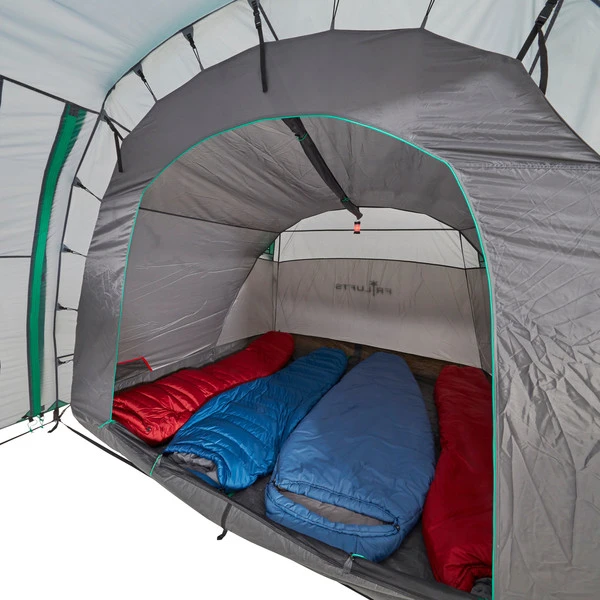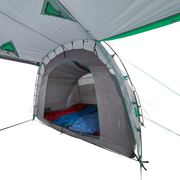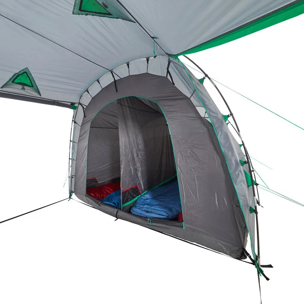 Werden beide Innenzelte ausgehängt, kann das verbleibende Überzelt als Zelt für z.B. Gartenpartys dienen. Vier Eingänge, die teilweise auch hochgestellt werden können, bieten nicht nur eine gute Aussicht, sondern mit den acht weiteren Lüftern auch eine optimale Raumbelüftung. Die Fenster stellen jedoch auch bei geschlossenen Eingängen eine gute Sicht nach draußen bereit.