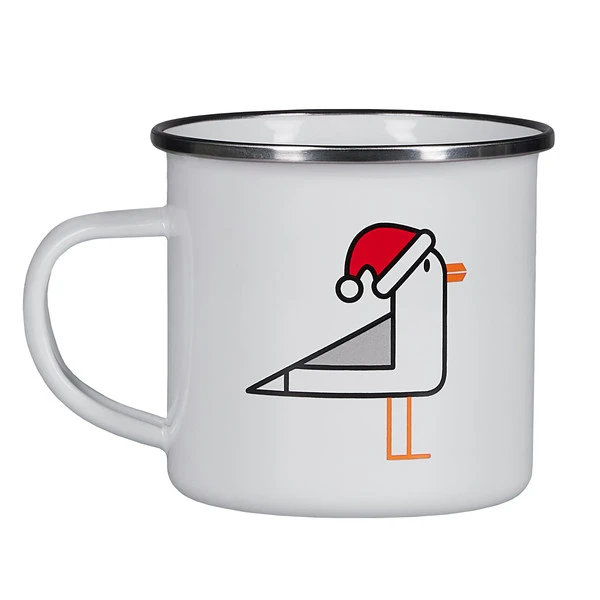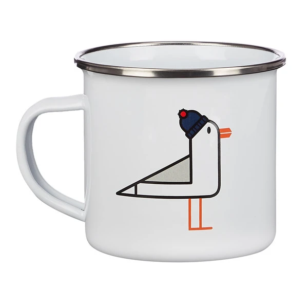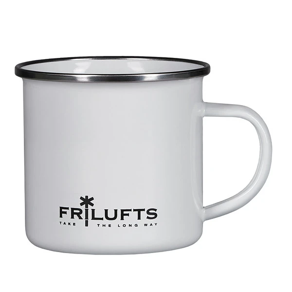 Lackierter Emaille-Becher mit Frilufts Print und Edelstahlrand. Gut geeignet für den morgendlichen Kaffee am Lagerfeuer. Der Becher fasst 350 ml und misst 8 x 9 cm (HxB).