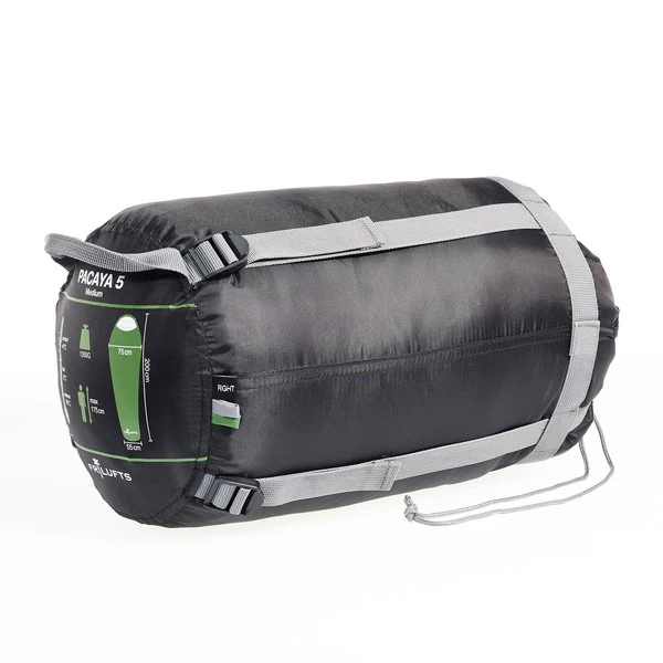 Der Pacaya 5 ist mit zweilagig verarbeiteter Hohlfaser gefüllt. Das angenehm weiche, schnelltrocknende Mikrofaser-Innenfutter ist aufgeraut und hat eine baumwollähnliche Haptik. Die Kapuze kann mit einem Schnürzug zugezogen werden. Der Schlafsack lässt sich weit öffnen und als Decke verwenden. Außerdem ist die Links-/Rechts-Variante koppelbar.